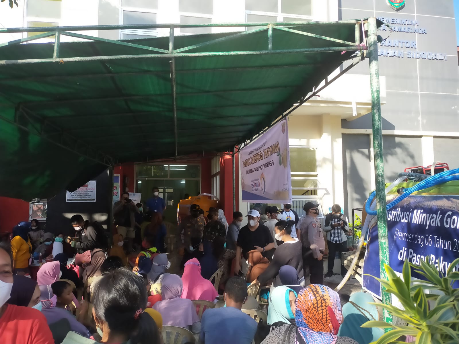 PUBLIKKALTIM.COM, SAMARINDA – Ratusan warga mengantri untuk membeli minyak goreng curah dengan harga murah di Kelurahan Sidodadi, Kecamatan Samarinda Ulu, Sabtu (12/3/2022).