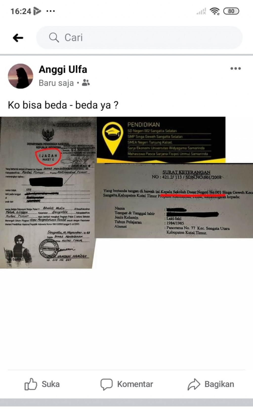 Sementara pada bagian bawah foto, tertulis kiri bawah Surat Keterangan dari Sekolah Dasar Negeri No 001 Singa Teweh, Kec. Sangatta, Kutai Timur.