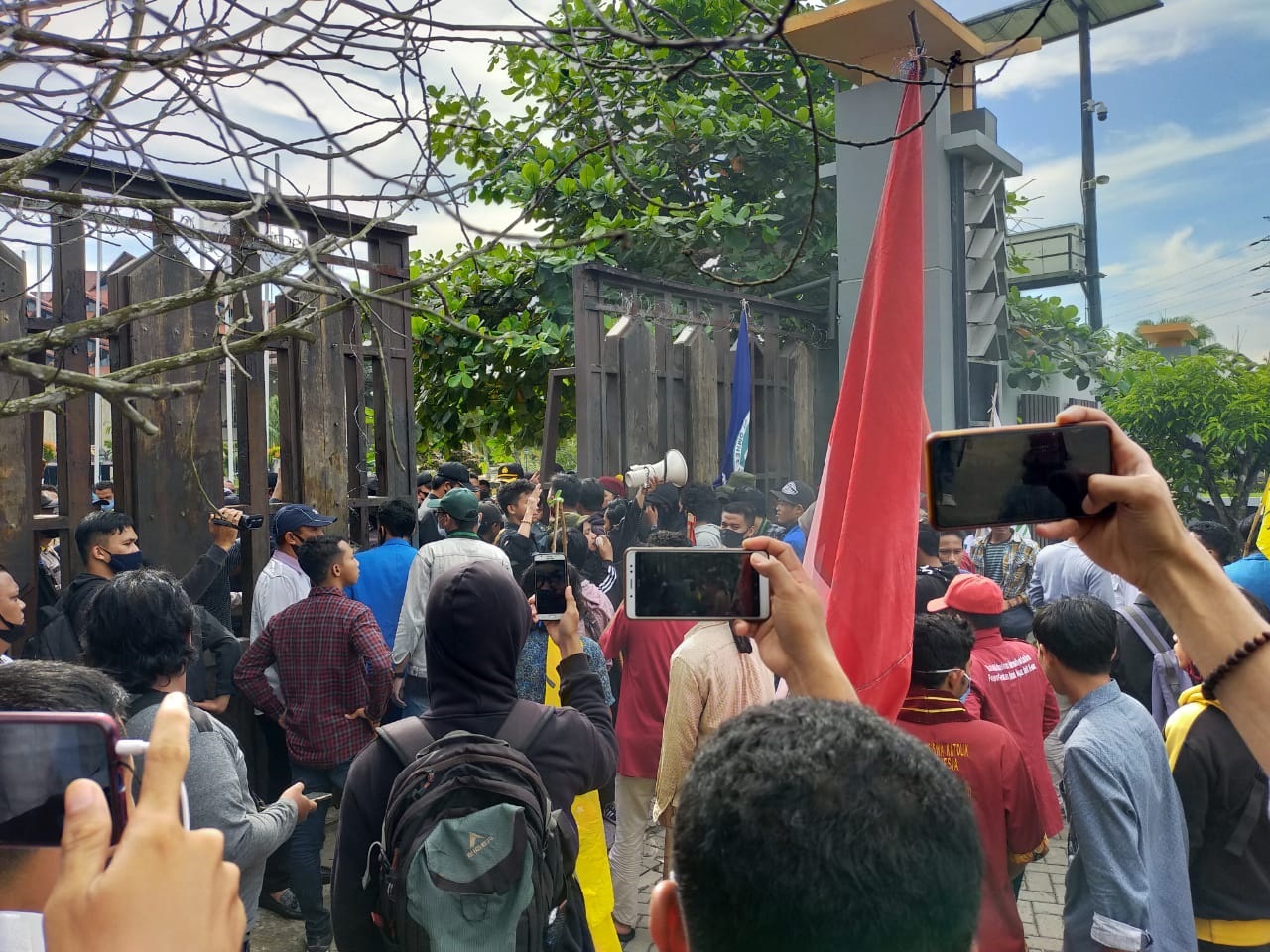 “Kami tidak terima atribut demo kami dimatikan secara paksa,” teriak massa aksi.