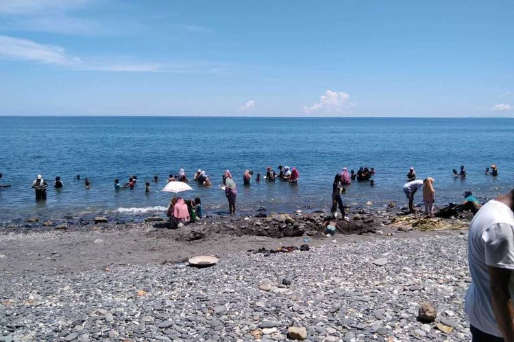 Warga berbondong-bondong mendatangi pesisir guna mendulang butiran emas, yang membaur dengan pasir.