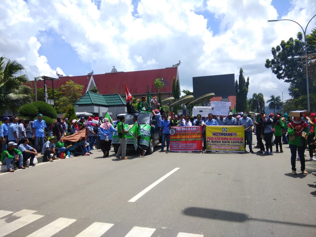 PUBLIKKALTIM.COM, SAMARINDA – Ratusan karyawan yang tergabung dalam serikat buruh PT. Rimba Raya Lestari lakukan aksi unjuk rasa di depan kantor Gubernur Kaltim, Samarinda, Senin (21/10/2019).