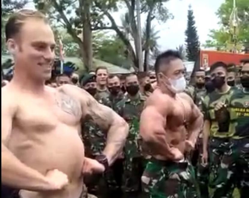Keduanya saling menunjukkan aksi mirip binaragawan di kelilingi para prajurit TNI AD dan US Amry di lokasi latihan bersama Garuda Shield 2021.