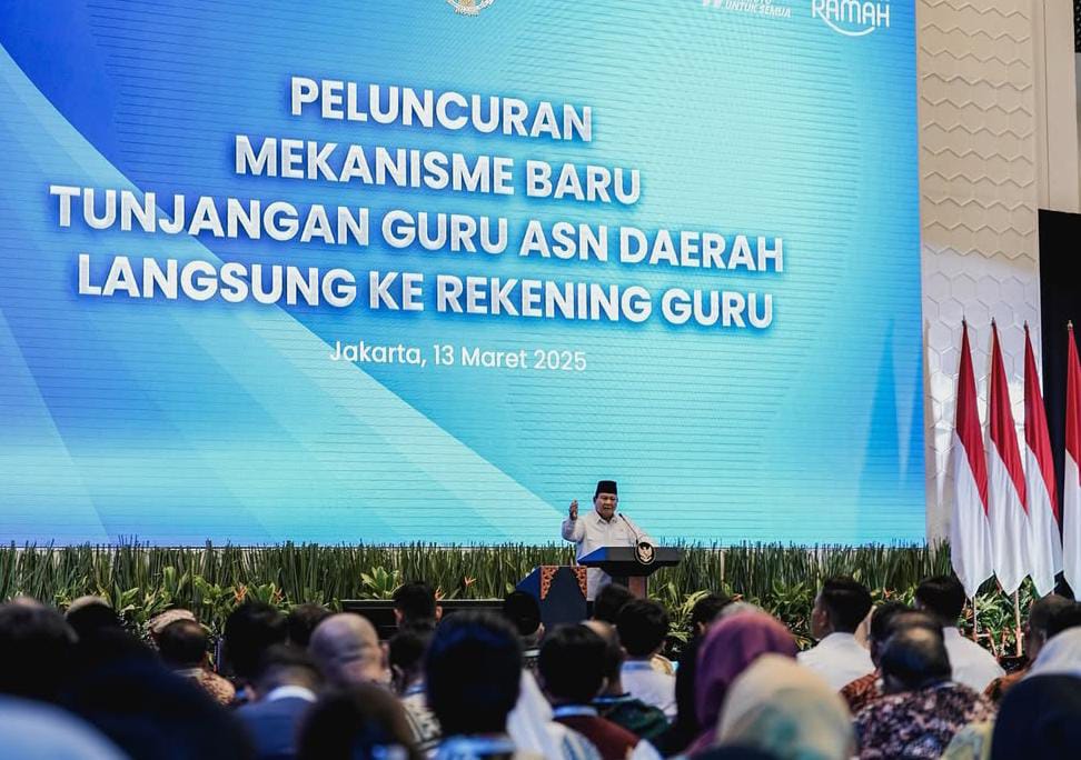 “Saya menyambut baik inisiatif, upaya peluncuran, upaya mekanisme baru dengan mengirim tunjangan guru ASN daerah langsung ke rekening guru, inilah upaya untuk mengurangi tidak efisiensi,” kata Prabowo.