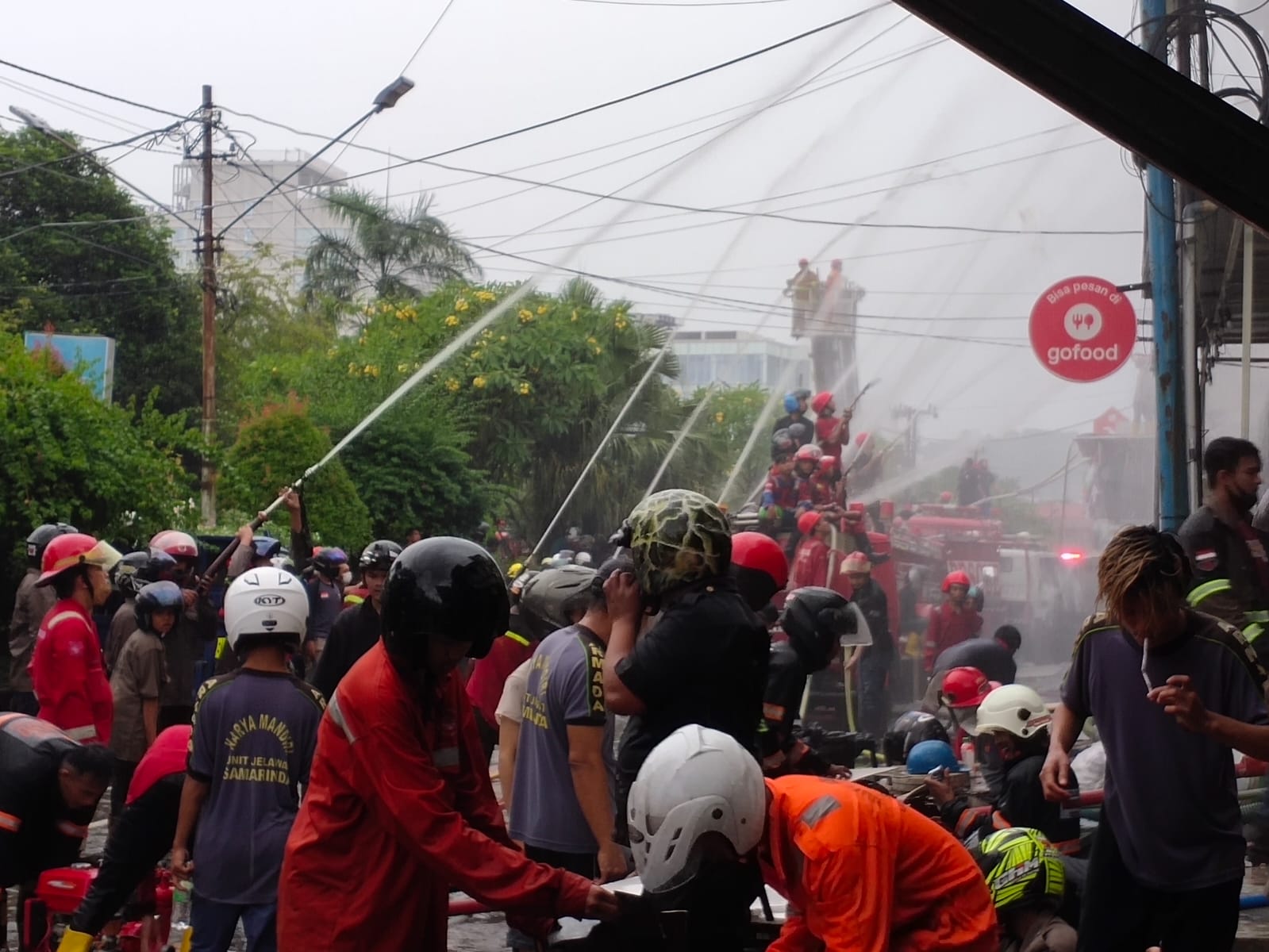 Bahkan hingga lebih dua jam lamanya, dan saat hujan deras mengguyur Kota Tepian, pemadam jua terus bekerja mengarahkan tembakan air di selang mereka ke dua bangunan ruko yang dilahap si jago merah.