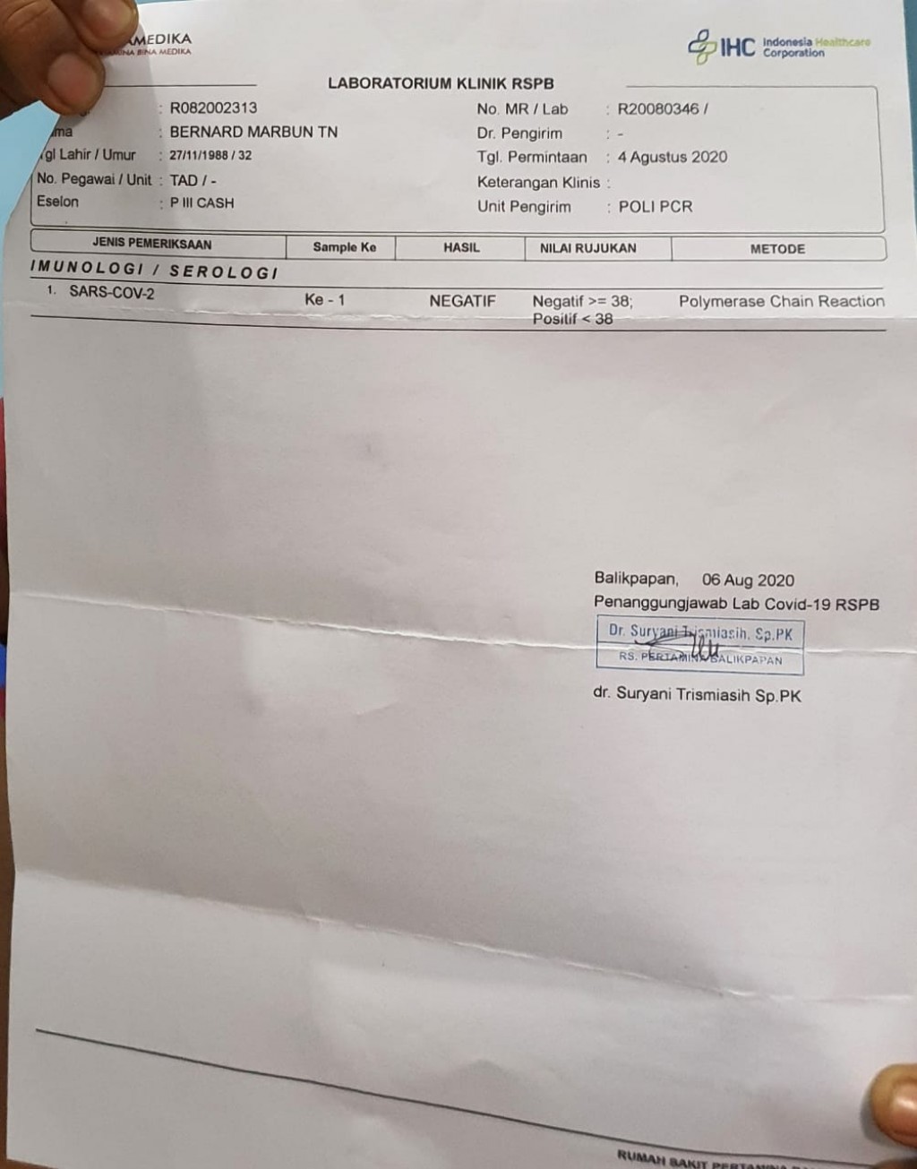 Lanjut Bernard, kesimpang siuran tersebut akhirnya membuat ia memutuskan untuk melakukan swab test mandiri di RS Pertamina Balikpapan pada 4 Agustus kemarin.