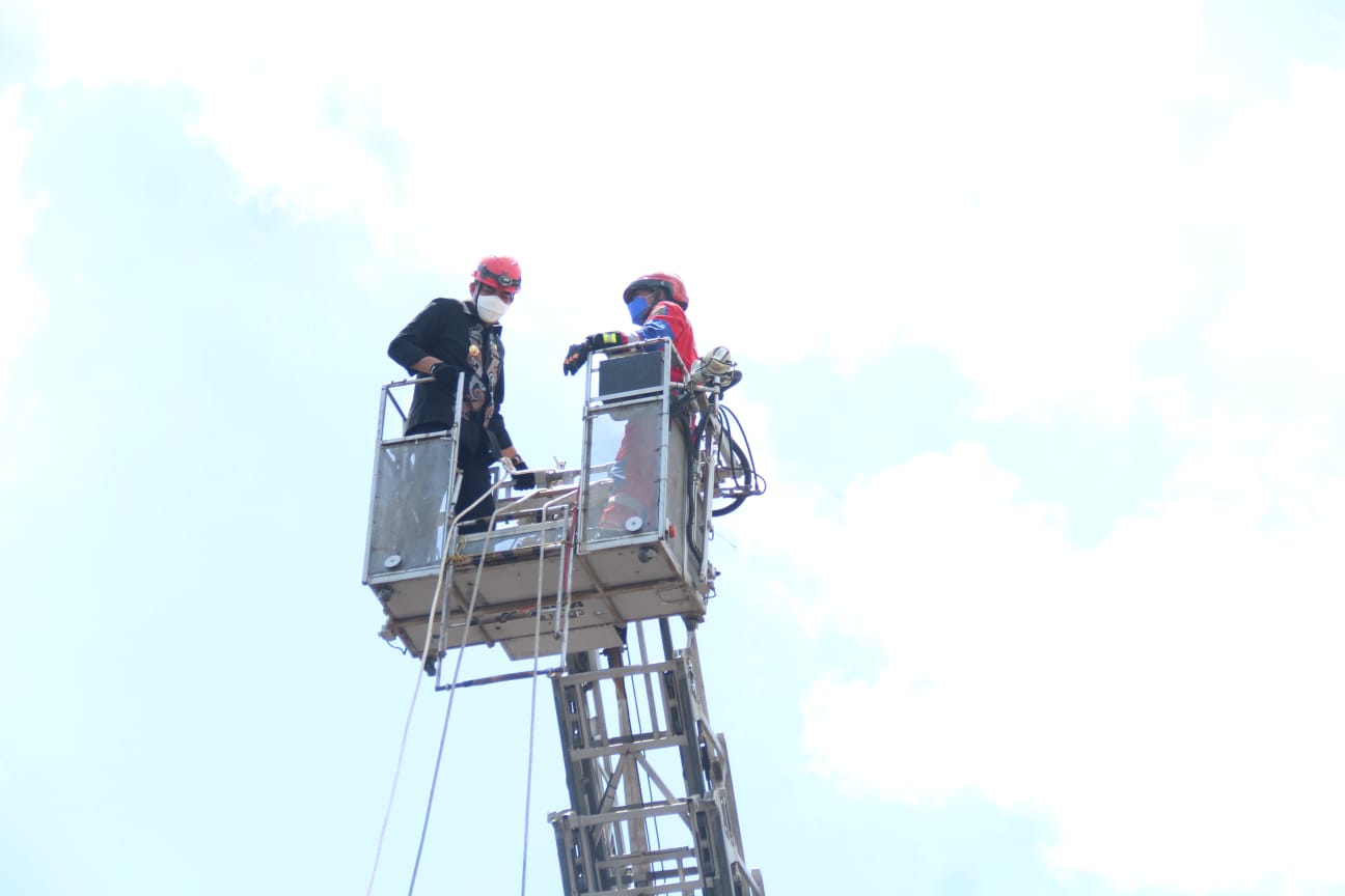 Andi Harun didampingi petugas profesional Damkar mencoba menaiki unit kendaraan pemadam kebakaran jenis Turntable Tender dan Snorkel atau mobil dengan tangga otomatis yang digunakan untuk memadamkan api dengan tingkat ketinggian tertentu atau mobil penyelamatan untuk bangunan yang tinggi.