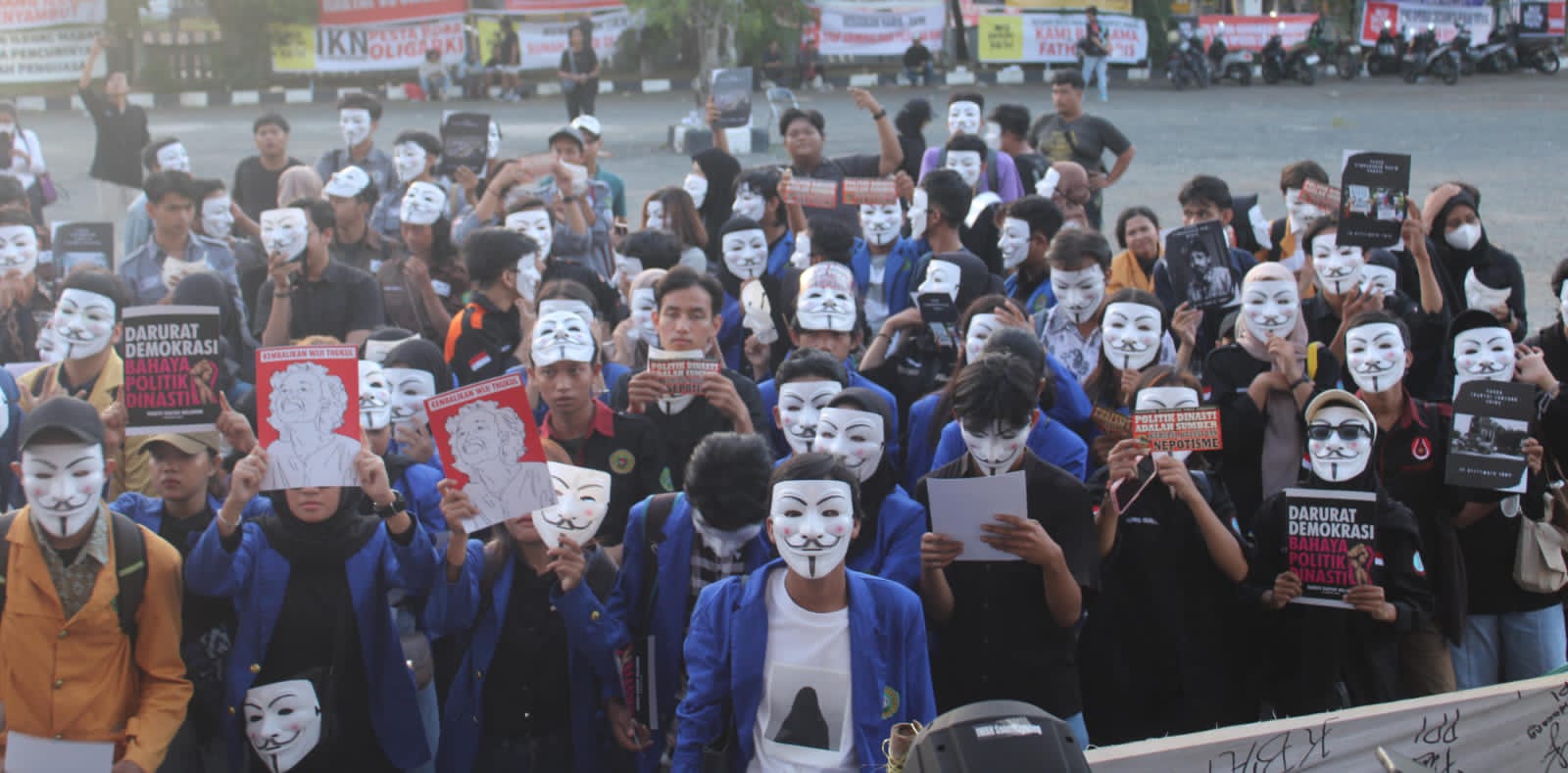 Pada aksi ini mahasiswa tampak mengenakan topeng Guy Fawkes, yang menjadi simbol perlawanan terhadap kondisi politik saat ini.