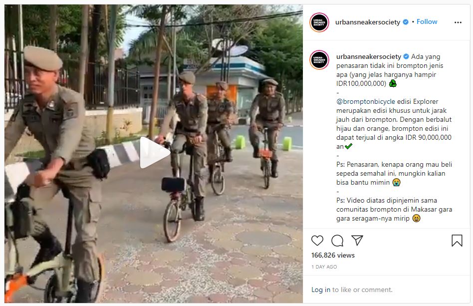 Dengan berbalut cat warna hijau dan oranye, sepeda dari Inggris ini dapat terjual di angka Rp 90.000.000. “Video dipinjemin sama comunitas Brompton di Makassar gara-gara seragamnya mirip,” lanjut caption di samping video ini.